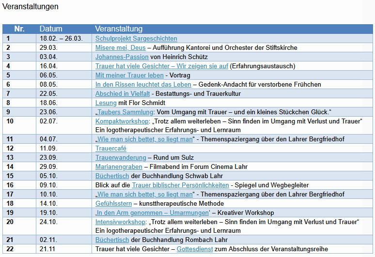 Das Ende der Veranstaltungsreihe ist der Gottesdienst am 21. November 2026 mit dem Titel der Reihe „Trauer hat viele Gesichter“. Musikalische Aufführungen, Andachten, Workshops, Filmvorführungen, Trauerwanderungen, Autorinnenlesungen, Trauercafé und Einblicke in die Trauerbegleitung sind nur Auszüge aus dem umfangreichen Jahresprogramm. Durch die Impulse und im gemeinsamen Austausch wie auch in praktischen Übungen kann erlebt werden, dass Trauer eine sehr natürliche Reaktion ist, auf Verluste zu reagieren und kann Orientierung bieten, bewusst mit Abschieden und Veränderungen umzugehen. Alle Veranstaltungen mit Informationen zu Anmeldung und Kosten sind im Flyer zur Veranstaltungsreihe und im Netz ersichtlich: